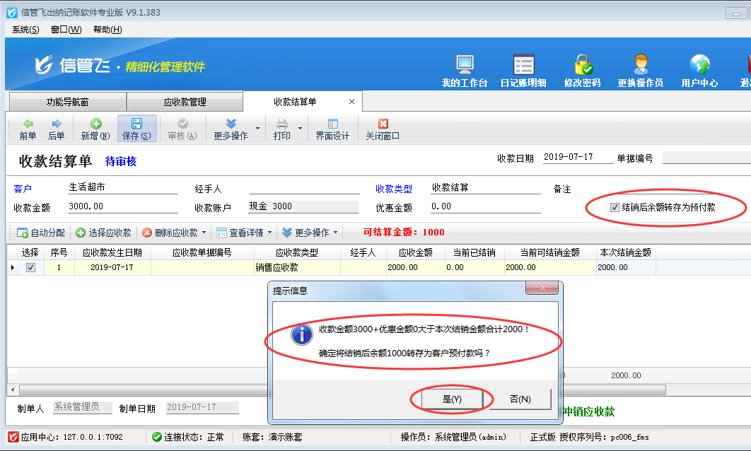 在應(yīng)收款管理界面點擊“收款結(jié)算”按鈕可以打開收款結(jié)算單對應(yīng)收款進行收款結(jié)算,單據(jù)主體“收款金額”錄入3000元,單據(jù)明細(xì)中“本次結(jié)銷金額”錄入2000元,保存收款結(jié)算單時系統(tǒng)提示“收款金額3000+優(yōu)惠金額0大于本次結(jié)銷金額合計2000!........”無法保存成功!