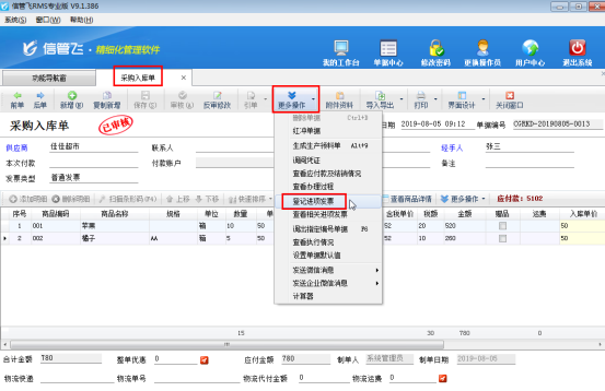 發(fā)票管理為擴展模塊,只有信管飛RMS標準版和專業(yè)版支持附加使用。填開發(fā)票除了在發(fā)票管理中直接進行新增,軟件也支持在開單界面直接填開發(fā)票操作。本文以信管飛RMS專業(yè)版的采購入庫單為例,講一下在采購入庫單中如何快速填開發(fā)票操作。