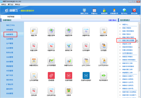 在功能導(dǎo)航窗點(diǎn)擊“銷售管理”,銷售管理模塊最右側(cè)相關(guān)查詢統(tǒng)計(jì)內(nèi)打開“銷售訂單交貨提醒”,如下圖所示: