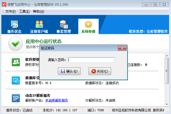 應(yīng)用中心的管理和配置會(huì)對(duì)軟件的運(yùn)行產(chǎn)生重大影響,因此軟件提供增強(qiáng)安全驗(yàn)證功能,啟用安全驗(yàn)證后執(zhí)行賬套管理、系統(tǒng)參數(shù)設(shè)置等功能時(shí)會(huì)要求輸入密碼,驗(yàn)證密碼通過(guò)后才可以進(jìn)行相應(yīng)操作。下面我們以信管飛倉(cāng)庫(kù)管理軟件應(yīng)用中心為例詳細(xì)介紹下如何啟用安全驗(yàn)證功能。