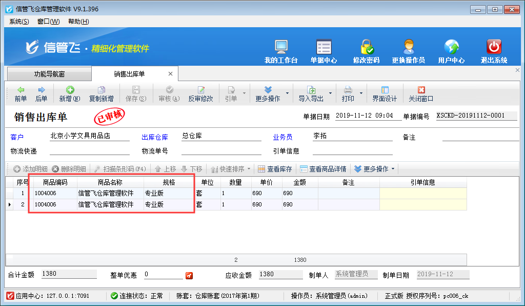信管飛送貨單軟件、信管飛倉庫管理軟件、信管飛RMS等軟件在新開業(yè)務(wù)單據(jù)時默認(rèn)在單據(jù)明細(xì)內(nèi)支持同一商品可添加多條記錄(如下圖所示),部分用戶在開單時需要設(shè)置在單據(jù)明細(xì)中同一商品不可錄入多行?該如何設(shè)置呢?本篇文章我們以信管飛倉庫管理軟件為例來介紹一下如何設(shè)置開單時單據(jù)明細(xì)中同一商品不可錄入多行。