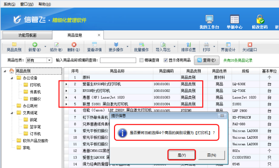 以圖1為例,要把第2行至第5行商品類別是“商品類別”的4條記錄的商品類別改為“打印機”。首先點擊第2行記錄,然后按下Shift鍵不松手時鼠標點擊第5行記錄,這樣就可以同時快速選中第2行至第5行這4條記錄,選中多條記錄后,再按住鼠標左鍵不松手,移動到商品類別“打印機”處,此時系統會提示“是否要將當前選擇4個商品的類別設置為【打印機】?”,點“是”按鈕即可,如圖2所示。
