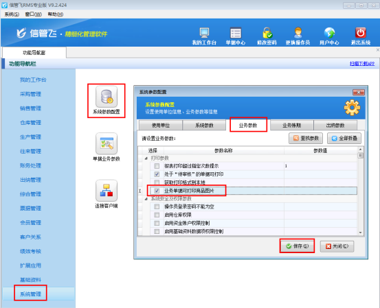在功能導(dǎo)航窗點(diǎn)擊“系統(tǒng)管理”—》“系統(tǒng)參數(shù)配置”—》“業(yè)務(wù)參數(shù)”,打勾“業(yè)務(wù)單據(jù)可打印商品圖片”,保存設(shè)置,如下圖所示: