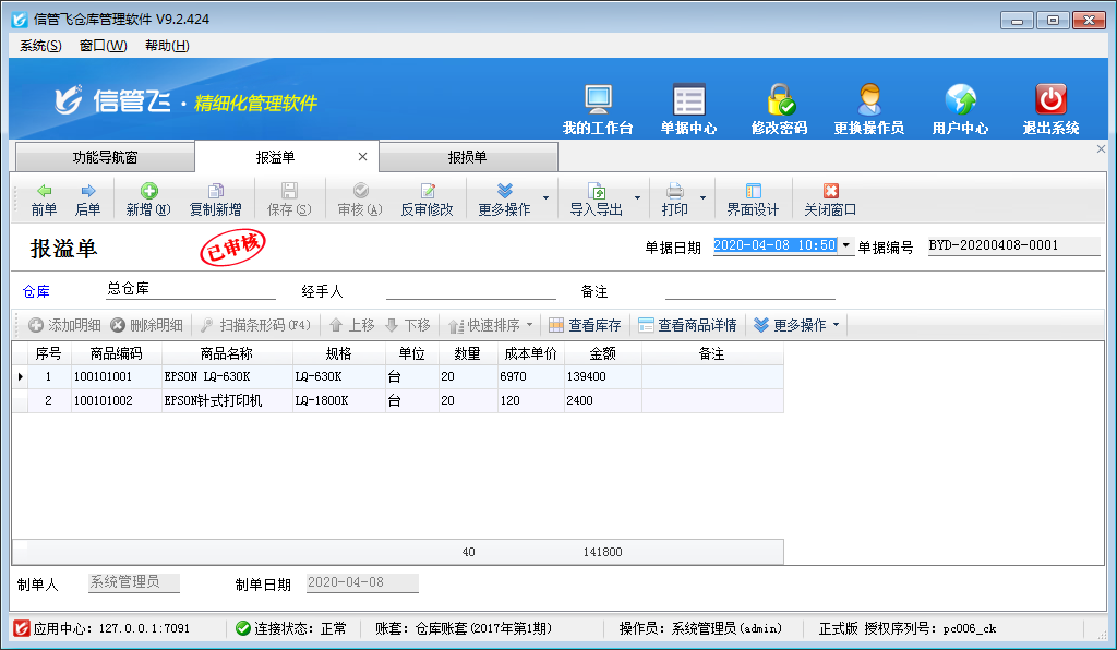 信管飛RMS、信管飛倉庫管理軟件都支持使用報溢單、報損單進行庫存數量調整,下面我們以倉庫管理軟件為例來演示一下具體的操作步驟。