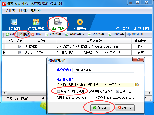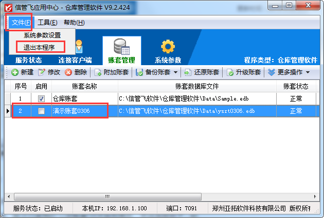 信管飛RMS信管飛倉庫管理軟件信管飛送貨單軟件信管飛出納記賬軟件信管飛票據(jù)打印軟件等軟件都含有賬套管理功能,在應用中心內(nèi)支持建立多個賬套,已使用的帳套如果不再繼續(xù)使用,可以停用帳套,停用帳套后,客戶端程序登錄時將無法再連接該帳套。本文我們以信管飛倉庫管理軟件為例演示一下如何停用帳套。