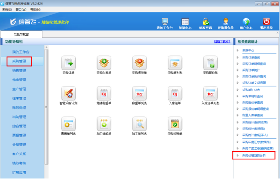 在功能導航窗點擊“采購管理”,在采購管理模塊最右側的相關查詢統計中找到“采購價格趨勢分析”,點擊打開。如下圖所示: