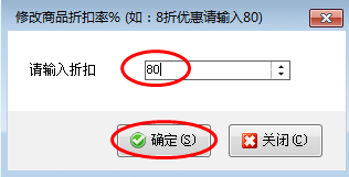 在單據(jù)明細(xì)上方,點(diǎn)擊“更多操作”—》“修改商品折扣”,彈出修改商品折扣率的窗口,輸入折扣(例如:8折優(yōu)惠就輸入80),然后點(diǎn)擊“確定”進(jìn)行保存,如圖2、圖3所示: