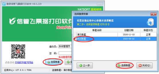 運行信管飛票據(jù)打印軟件客戶端(藍色圖標(biāo)),在軟件登錄界面點擊“選擇賬套”,在“選擇登錄賬套”界面選擇我們所需要的賬套,然后登錄軟件即可。