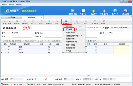 業(yè)務(wù)單據(jù)已審核后默認(rèn)是不允許刪除的,如果需要刪除,需要先紅沖此單據(jù),然后再刪除,即可刪除成功,在單據(jù)界面工具欄點(diǎn)擊“更多操作”—》“紅沖單據(jù)”即可紅沖單據(jù),如下圖所示: