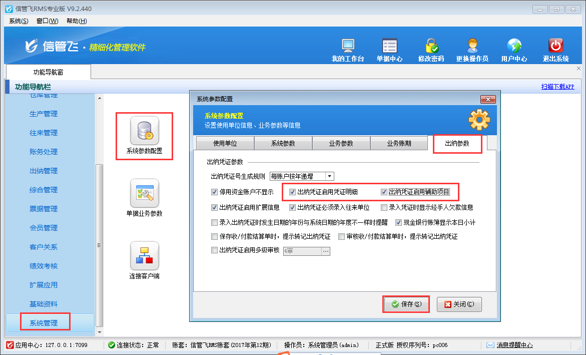 在功能導(dǎo)航窗點擊“系統(tǒng)管理”—》“系統(tǒng)參數(shù)配置”—》“出納參數(shù)”打開出納參數(shù)配置界面,然后啟用參數(shù)“出納憑證啟用憑證明細(xì)”、“出納憑證啟用輔助項目”,如下圖所示。