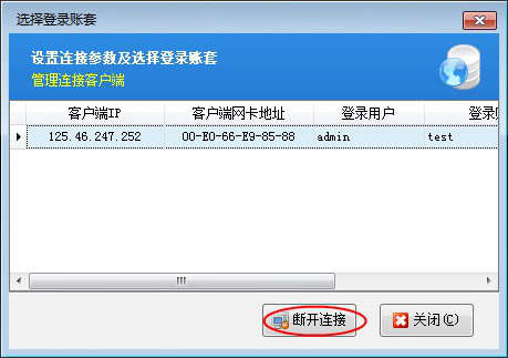 點擊“是”,進入管理連接客戶端界面。可以選擇當(dāng)前登錄的連接,點擊“斷開連接”,可斷開當(dāng)前已登錄的客戶端程序,然后可以重新登錄。如下圖所示: