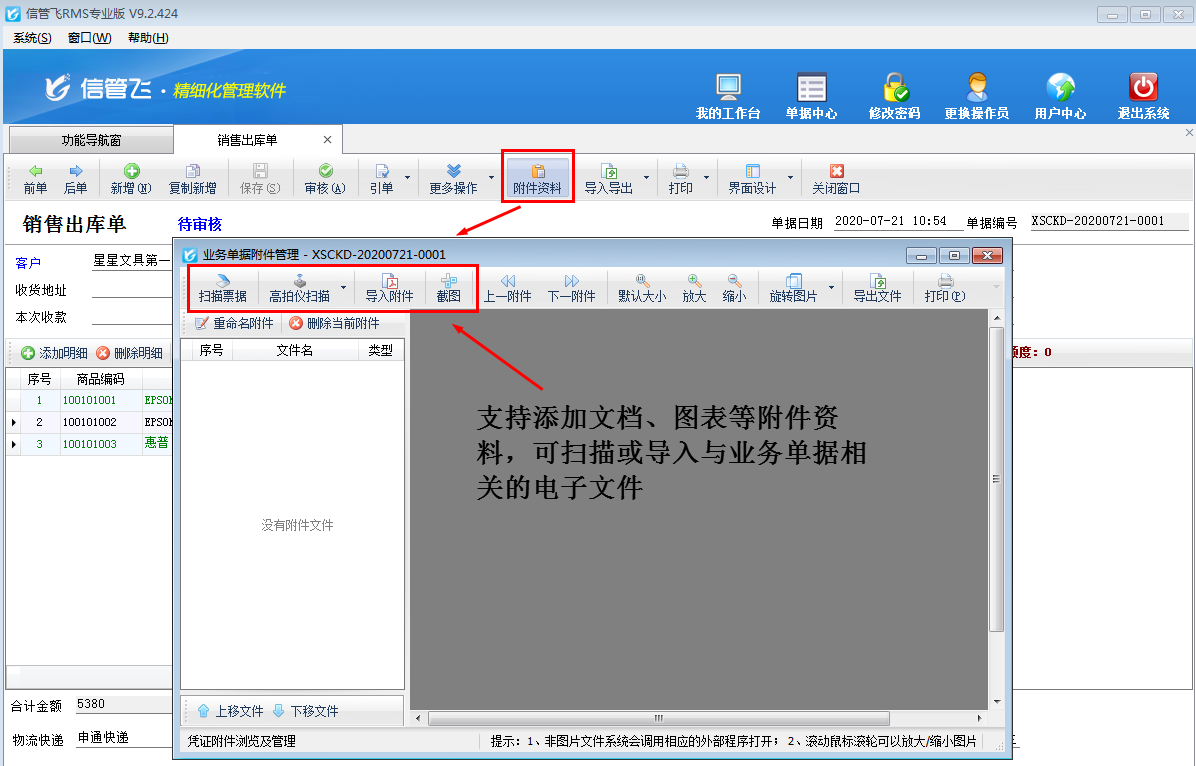 信管飛RMS進銷存管理軟件)新增或者修改業務單據時,支持添加文檔、圖表等附件資料,可掃描或導入與業務單據相關的電子文件,方便用戶更全面、直接地查詢業務單據的全過程,有利于企業對業務單據的管理(如下圖所示),附加資料窗口默認顯示模式支持大窗口和小窗口兩種顯示模式,本文介紹一下如何設置附件資料窗口默認顯示模式?