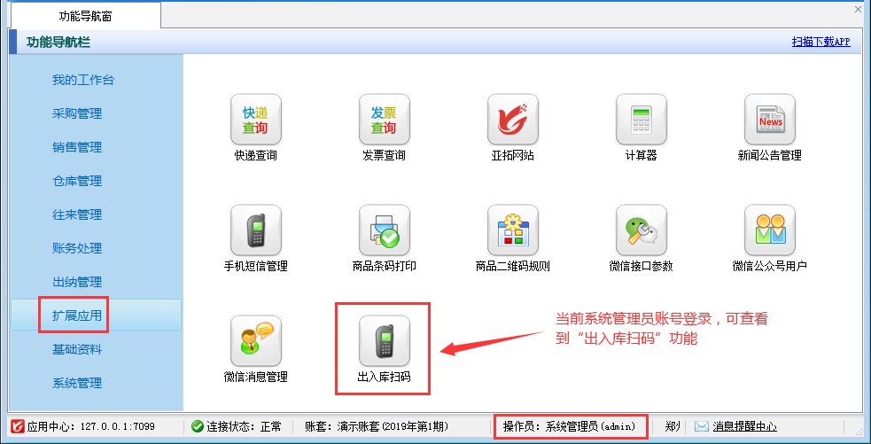 操作員權(quán)限設(shè)置完成后,使用操作員“張亞”登錄軟件,打開擴(kuò)展應(yīng)用模塊,可以看到操作員已無法查看到“出入庫(kù)掃碼”功能,如下圖所示。