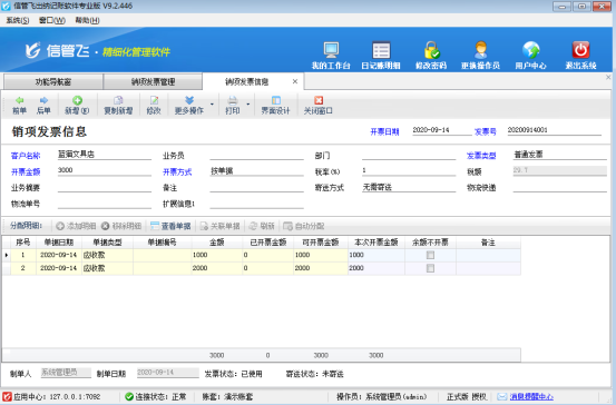 在功能導航窗點“票據管理”—》“銷項發票管理”,新增銷項發票,開票方式選擇“按單據”,然后點擊“添加明細”選擇需要開發票的應收款記錄,然后再錄入開票金額及其他信息后保存單據,如圖1所示: