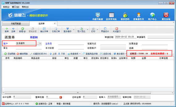 配置保存后,在功能導航窗點擊“業務處理”—》“新開送貨單”,在新開送貨單界面選擇客戶名稱后,此時可以看到單據明細上方會顯示這個客戶的應收款信息,即客戶的欠款,如下圖所示:
