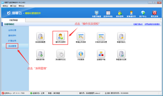 登錄軟件,在功能導航窗點擊“系統管理”—》“操作員及授權”,進入“操作員管理及授權”界面,選擇操作員“張亞”,在其右側的功能模塊權限內選擇“統計查詢”模塊,將送貨明細對賬單的“導出”權限勾選取消,然后保存設置,如下圖所示: