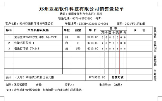 信管飛送貨單軟件信管飛RMS軟件等都支持打印單據,軟件內置了十幾種打印模板以供使用。默認打印模板的金額是按財務樣式進行顯示的,默認金額格式是按7位顯示,只顯示到萬,如果出現金額超過萬位會顯示不出來(如下圖所示),本文以“信管飛送貨單軟件”為例,示范下如何修改金額樣式的顯示數字個數
