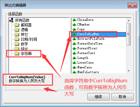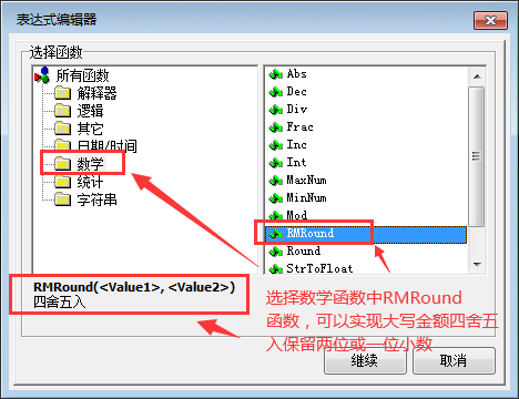 打開模版設計界面后,在模版合適的位置添加一個文本框,雙擊文本框打開文本編輯器,然后錄入內容“[CurrToBigNum([RMRound([單據主體."應收應付金額"],2)])]”或者是通過“插入表達式”插入數字轉換人民幣大寫函數,如下圖所示。