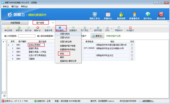 在功能導航窗點擊“基礎資料”—》“客戶信息”,在客戶信息界面選擇客戶“亞拓公司測試”,選擇工具欄“更多操作”下的“鎖定”,可鎖定此客戶信息,鎖定狀態為紅色顯示,如下圖所示: