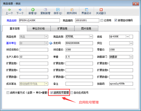 信管飛RMS進銷存管理軟件)專業版支持批號管理功能,可以對商品進行分批次出入庫,如下圖所示,在編輯商品信息界面勾選“啟用批號管理”,即可啟用此商品批號管理功能。