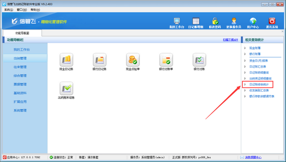然后在“出納管理”模塊最右側(cè)的“相關(guān)查詢統(tǒng)計(jì)”內(nèi)點(diǎn)擊“日記賬綜合統(tǒng)計(jì)”,打開“日記賬綜合統(tǒng)計(jì)”界面,如下圖所示。
