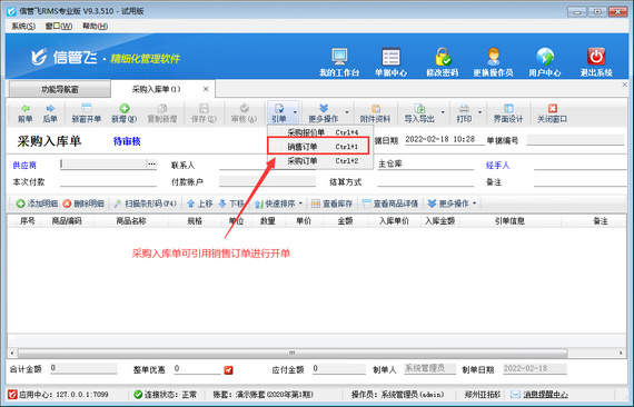 信管飛RMS(進銷存管理軟件)支持根據(jù)銷售訂單進行采購入庫進貨(如下圖所示),同時也支持配置操作員采購入庫單引用銷售訂單開單權限,本篇文章介紹一下進銷存管理軟件內如何設置操作員開采購入庫單不可引用銷售訂單?