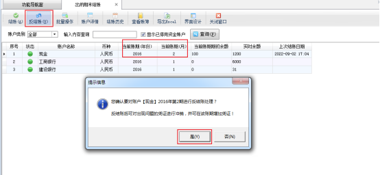 在功能導航窗點擊“出納管理”—》“出納期末結賬”,進入出納期末結賬界面,選中當前使用賬戶,點擊反結賬按鈕,反結賬完成后,相應賬戶回退到上一個賬期,賬期的起始日期是2016-01-01,如下圖所示: