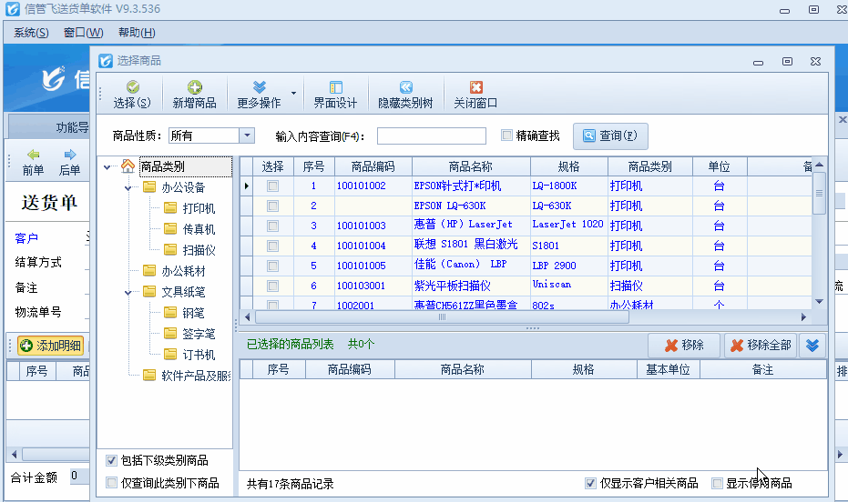 信管飛送貨單軟件開送貨單前可提前添加好商品信息到基礎(chǔ)資料中,新開送貨單選擇客戶后,選擇“添加明細(xì)”可彈出選擇商品界面,可選擇添加好的商品信息,有用戶反映在選擇商品界面,查詢窗口輸入商品簡寫不自動過濾,需要點擊下查詢才會進(jìn)行檢索,如下圖所示: