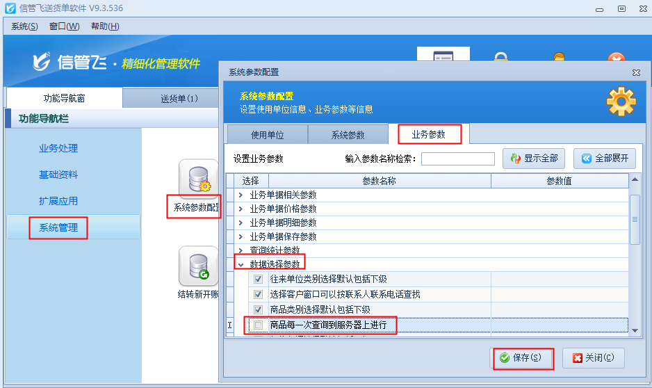 經(jīng)檢查發(fā)現(xiàn),原因是啟用了參數(shù)影響,解決辦法如下,在功能導(dǎo)航窗點擊“系統(tǒng)管理”—“系統(tǒng)參數(shù)配置”,在“業(yè)務(wù)參數(shù)”的選擇參數(shù)中取消勾選參數(shù)“商品每一次查詢到服務(wù)器上進(jìn)行”,然后保存設(shè)置,如下圖所示: