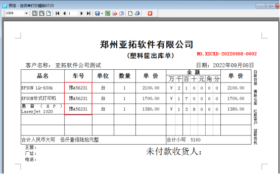 新增一個送貨單,保存單據(jù)后預(yù)覽默認模板顯示送貨車號,如下圖所示: