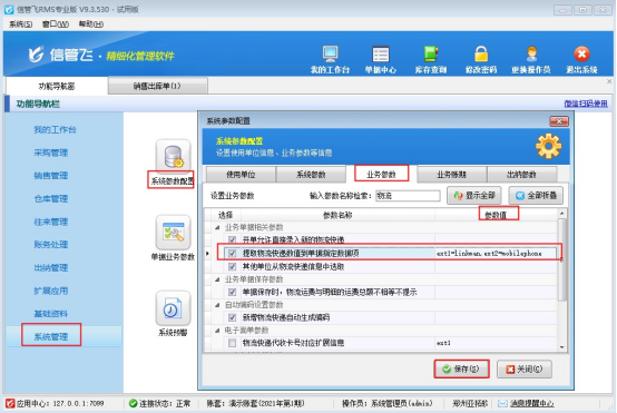 登錄軟件在功能導航窗點擊“系統管理”—》“系統參數配置”,業務參數勾選啟用“提取物流快遞數值到單據指定數據項”,參數值設置指定數據項:ext1=linkman,ext2=mobilephone,(擴展信息1取聯系人,擴展信息2取手機),保存配置,如下圖所示: