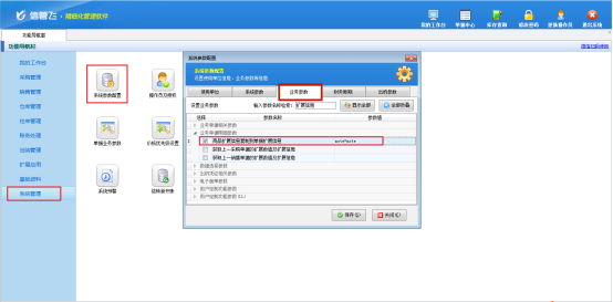 在功能導航窗點“系統管理”—》“系統參數配置”進入“系統參數配置”界面,業務參數下找到“業務單據明細參數”,勾選“商品擴展信息復制到單據擴展信息”,參數值輸入相應提取的備注信息,需要輸入“note=note”,設置后點擊“保存”按鈕。