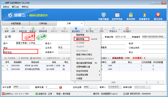 無定金的訂單,已審核已完成狀態的訂單可直接打開,在更多操作下點擊“紅沖單據”,先紅沖作廢,然后再點擊“刪除單據”可以直接刪除成功,如下圖所示: