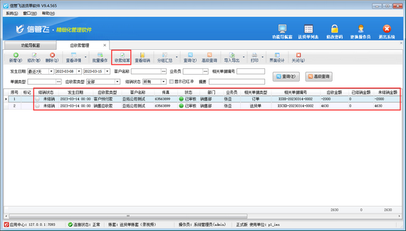 以信管飛送貨單軟件為例,在功能導航窗點擊“業務處理”—》“應收款管理”打開“應收款管理”界面。訂單如有錄入“預付定金”,系統會自動生成了一筆未結銷的“客戶預付款”記錄,客戶預付款應收金額為負數顯示。送貨單確認開單后系統會自動生成了一筆未結銷的“銷售應收款”記錄,如下圖所示。