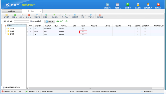 信管飛RMS軟件信管飛倉庫管理軟件信管飛送貨單軟件都支持設置員工可作為操作員登錄軟件,但是部分用戶在設置員工可登錄軟件時,發現“可登錄”是無法直接勾選的,如下圖所示,本文以“信管飛RMS軟件”為例介紹一下如何設置員工可登錄軟件?