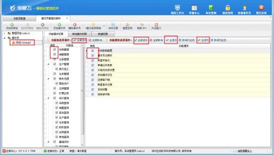 選中操作員賬號,設置操作員權限,權限可勾選進行設置,也可直接點擊全選批量設置。