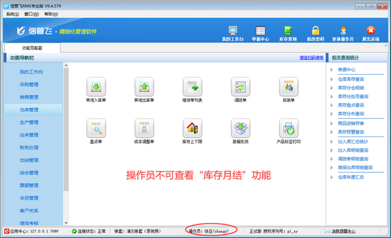 操作員權(quán)限設(shè)置完成后,使用操作員“張亞”登錄軟件,打開(kāi)倉(cāng)庫(kù)處理模塊,可以看到操作員賬號(hào)已無(wú)法查看到“庫(kù)存月結(jié)”功能,如下圖所示。