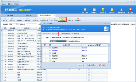 修改完成后操作全選并復制Excel文件內(nèi)容,在軟件批量維護界面點擊工具欄“導入更新”按鈕,導入界面粘貼文件,下一步自動匹配對應數(shù)據(jù)項,選擇商品判斷方式,再點擊“開始導入”,如下圖所示: