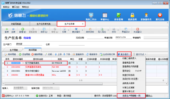在功能導航欄點擊生產管理--生產任務單,在生產任務單界面選擇用料明細,點擊更多操作下-----選擇生產明細唯一碼,每一條用料明細都需要對應生產明細唯一碼,然后保存任務單,如圖所示: