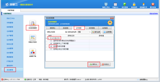 在功能導(dǎo)航窗點(diǎn)擊“系統(tǒng)管理”—》“系統(tǒng)參數(shù)配置”—》“業(yè)務(wù)參數(shù)”,即可進(jìn)入到“業(yè)務(wù)參數(shù)”配置界面,在系統(tǒng)預(yù)警參數(shù)內(nèi)將“啟用負(fù)庫(kù)存預(yù)警”參數(shù)勾選啟用,設(shè)置完成后點(diǎn)擊“保存”按鈕保存配置,如下圖所示。