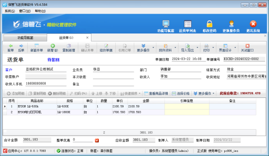 本文以“信管飛送貨單軟件”為例,示范下打印模板如何設置金額四舍五入保留兩位小數,打開一個送貨單,金額存在小數,打印預覽圖如下: