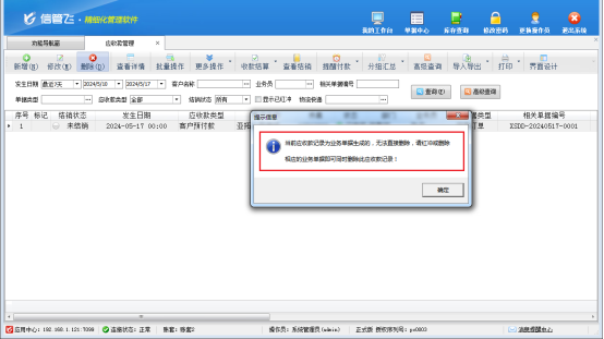有用戶在刪除預(yù)付款時(shí)可能會(huì)出現(xiàn)業(yè)務(wù)單據(jù)生成的應(yīng)收款記錄,無(wú)法直接刪除的情況,如圖,本篇文章介紹一下訂單生成的客戶預(yù)付款記錄,如何刪除?