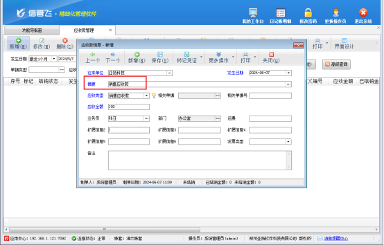 功能導航欄點往來管理-》應收款管理,新增一個應收款,摘要可根據實際需求自行進行錄入,信息錄入完成后點擊保存按鈕進行保存,保存后,應收款管理界面增加一條未結銷的銷售應收款記錄。