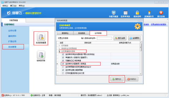 第一步:在功能導航窗點擊“系統管理”—》“系統參數配置”—》“業務參數”,即可進入到“業務參數”配置界面,在業務單據相關參數內勾選“送貨單允許直接錄入新商品”參數,然后點擊“保存”按鈕保存設置,如下圖所示: