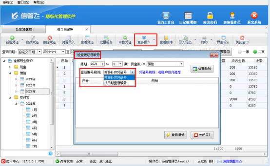 檢查憑證號斷號功能允許用戶定期對日記賬中的憑證號進行檢查,一旦發(fā)現(xiàn)斷號情況,可根據(jù)預(yù)設(shè)的規(guī)則進行自動調(diào)整,確保憑證號的連續(xù)性和準(zhǔn)確性。支持以下兩種編號規(guī)則:前移補齊憑證號、按日期重新編號,本文章示范按日期重新編號規(guī)則,在日記賬列表更多操作下點擊“檢查憑證號斷號”彈出檢查界面,如下圖所示: