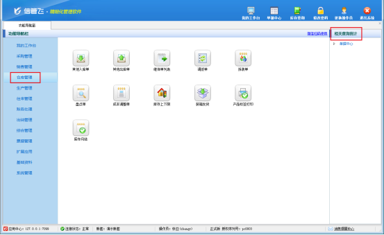 操作員權限設置完成后,使用操作員“張亞”登錄軟件,此時倉庫管理右側相關查詢統計已無法進行庫存查詢,如下圖所示。