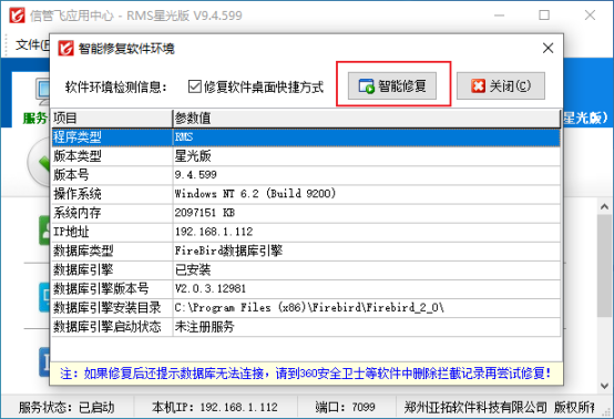智能修復軟件環(huán)境完成后,請重啟應用中心程序,然后查看下數(shù)據(jù)庫連接狀態(tài)是否顯示為連接成功(如下圖所示),數(shù)據(jù)庫狀態(tài)為連接成功,則軟件即可正常登錄。