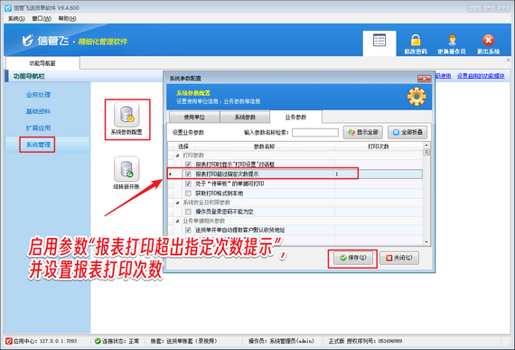 以信管飛送貨單軟件為例,通過簡單設置,即可實現操作員打印次數權限控制。首先,在系統參數中設置打印次數提示;