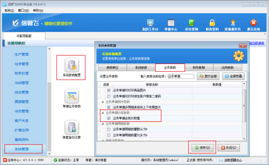 在左側的導航窗選擇“系統管理”—》“系統參數配置”的業務參數,業務單據價格參數下勾選上“業務單據含稅價取整”,如下圖所示: