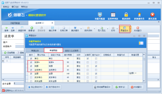 單據界面,點擊“界面設計”,在單據明細項勾選顯示稅率、稅額、含稅單價,如圖所示: